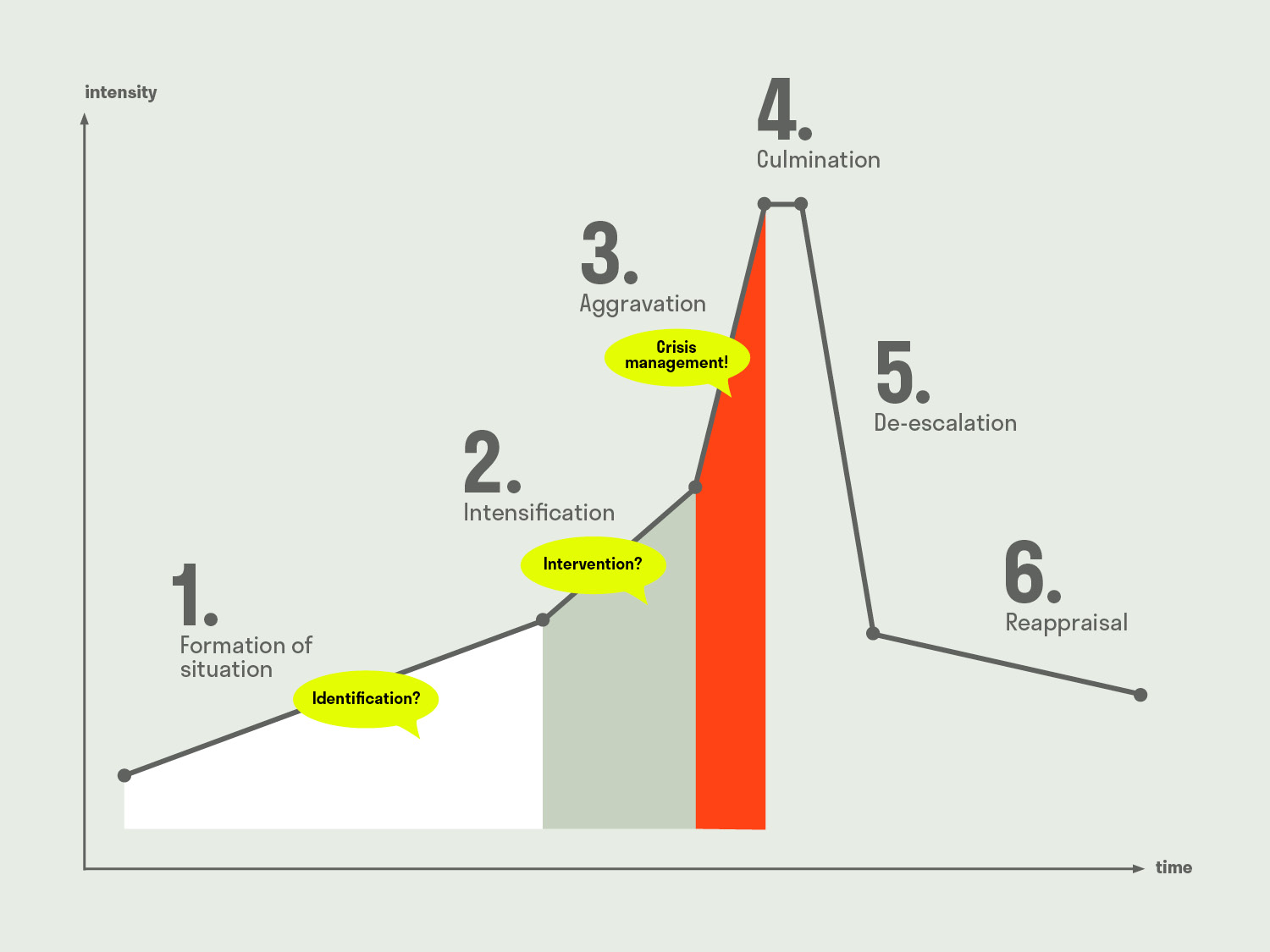 When we are mandated in crisis situations, we get to know our clients in a particularly demanding situation. It is essential to realise that a crisis situation is always perceived subjectively. In other words: it is of no importance whether we have already experienced cases in counselling which seemed comparatively ‘worse’. Instead, it is always crucial to understand the particular situation, identify the individual risk potential and discuss possible scenarios realistically. The dimensions of a crisis are usually defined by the extent to which it attacks or is capable of shaking the identity of the company or organisation.