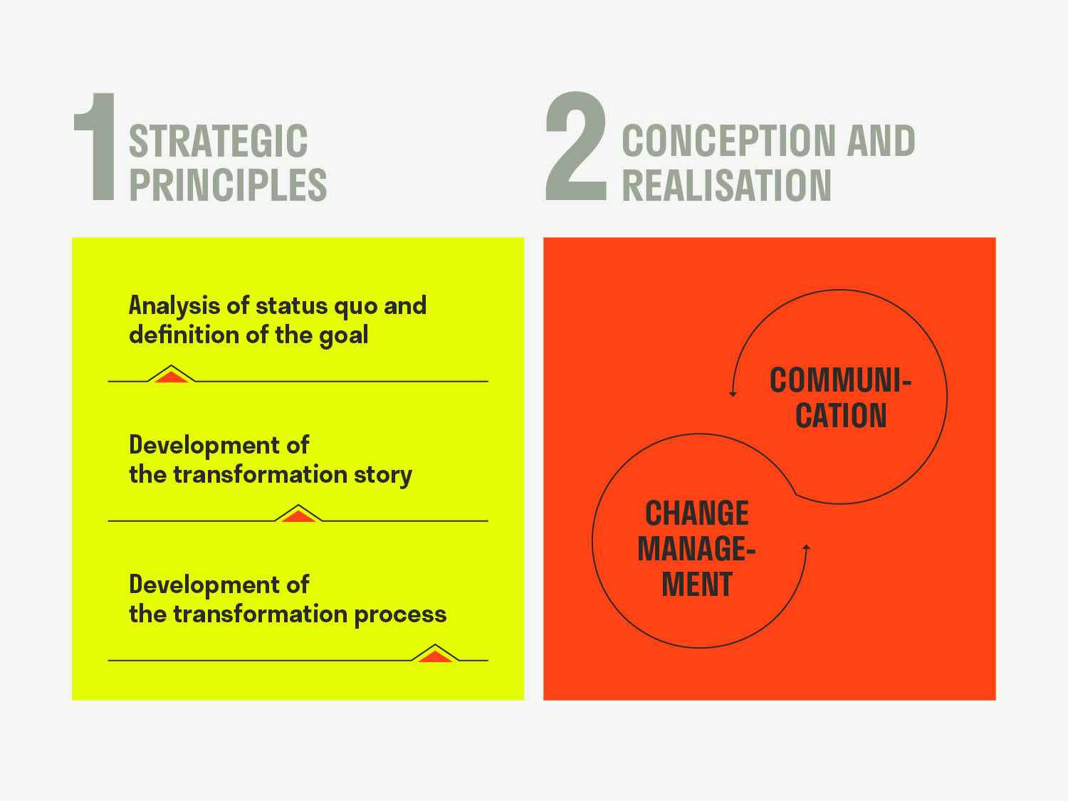 Our approach: we start thinking based on the goal of the transformation, and we develop strategically based communication that accompanies this transformation and enables its result. It makes clear why change is necessary and highlights the need for change. This makes communication a management tool in transformation situations.
